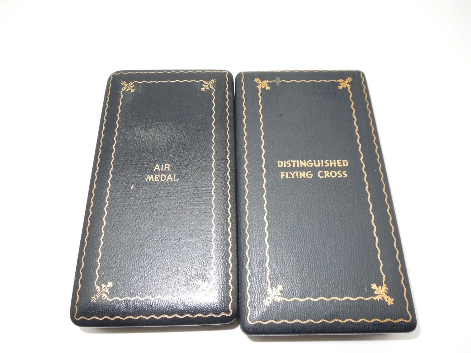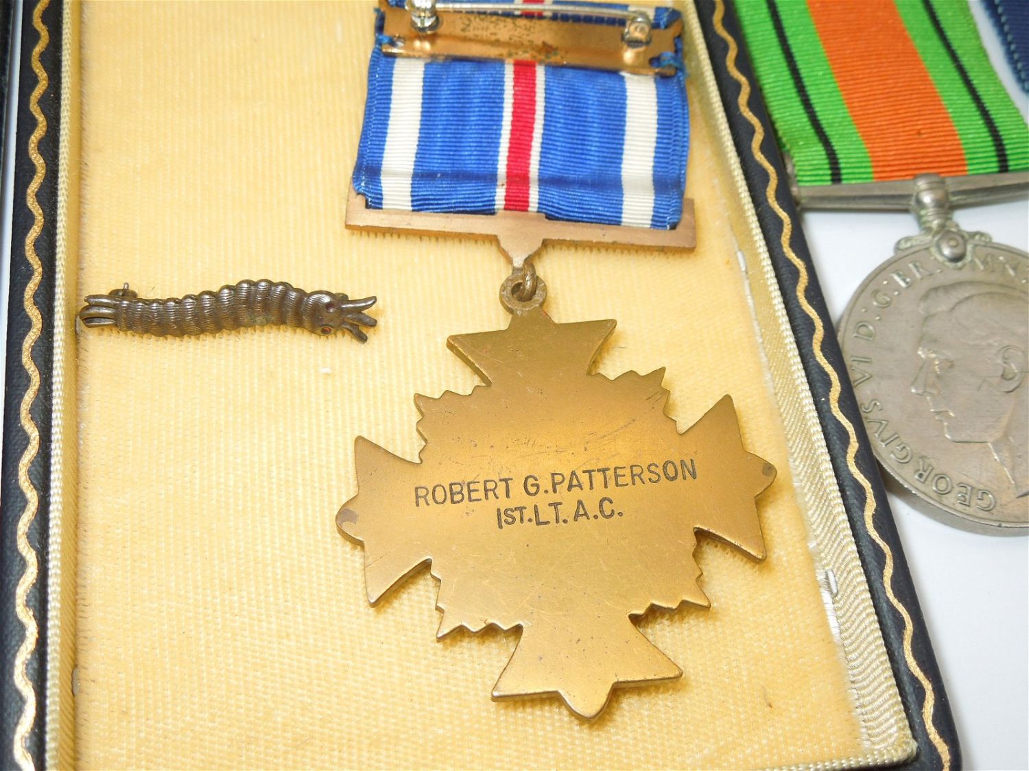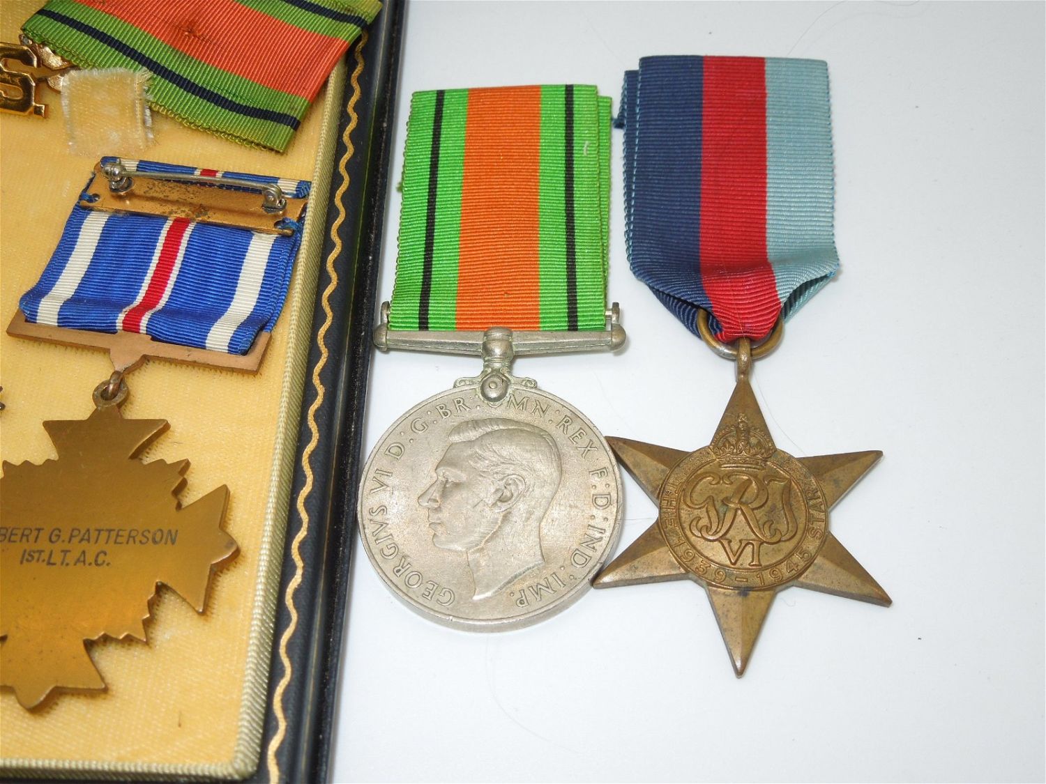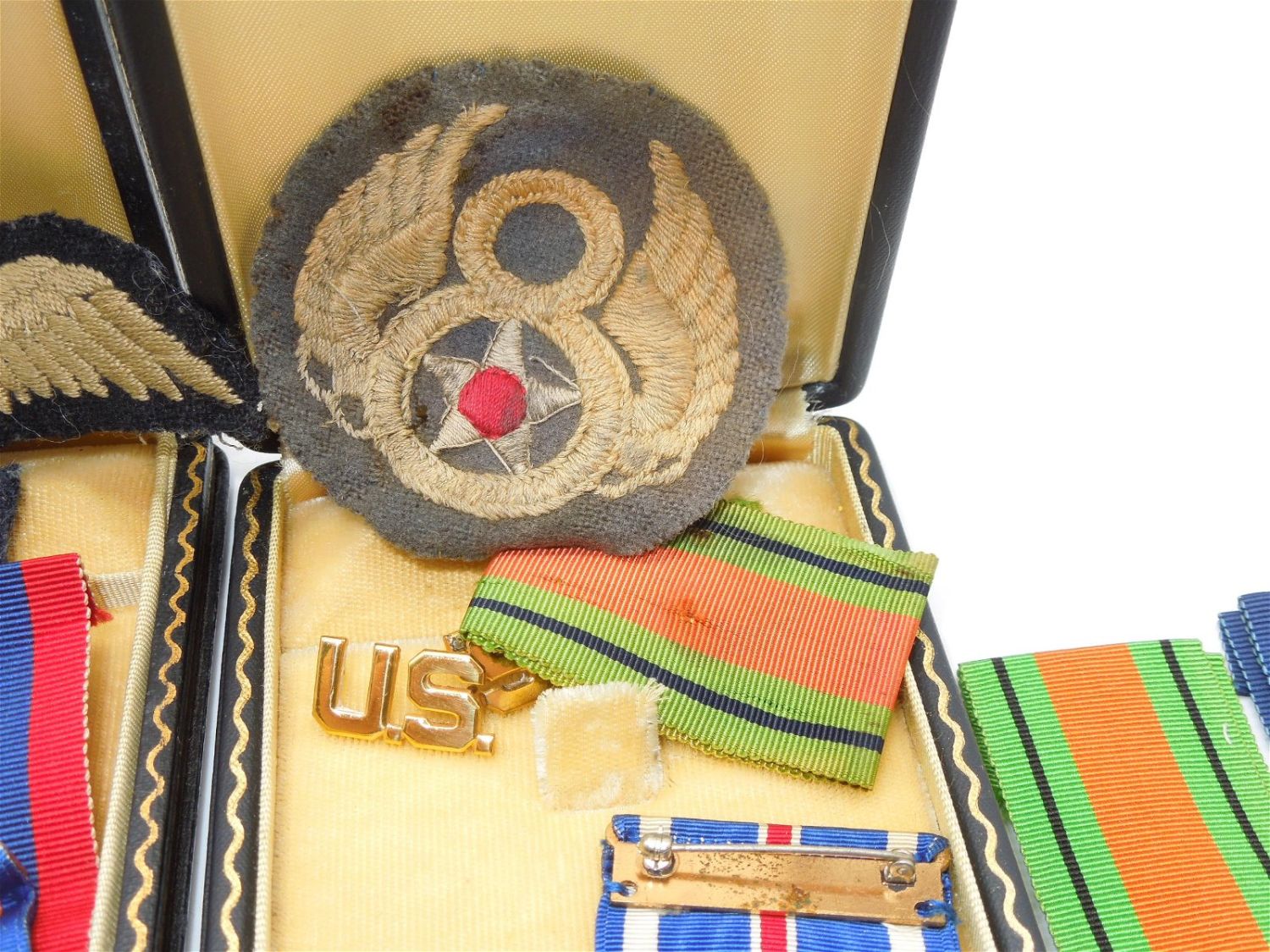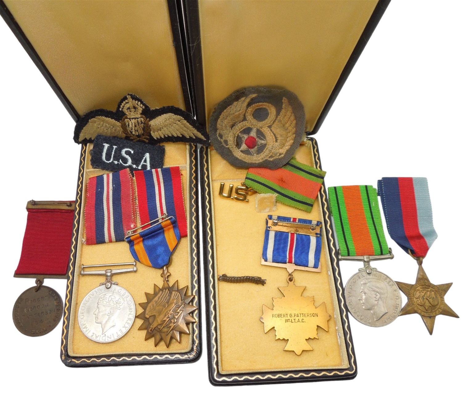 Named Medal Group to Robert Gordon Patterson. 1st Lt Robert G. Patterson was a WWII fighter pilot who was a member of the famed "Eagle Squadrons" that helped the British fight Nazi Germany before the United States entered the war. During the war he was attached to the 335th FS, 4th FG, 8AF USAAF formerley a 121 Eagle Squadron RAF Spitfire pilot. He flew Spitfires and P-47 Thunderbolts on 70 combat missions over Europe. On his last mission, on October 8, 1943, Patterson was shot down over Bremen, Germany, while escorting bombers. He evaded the enemy for 53 days before being captured in Amsterdam, according to military records. He spent the rest of the war in Stalag Luft I, a POW camp in Barth, Germany. The accounts of that day include his aircraft being attacked by German fighters over Holland. He was able to bale out and managed to evade capture for a time, but was finally captured in Amsterdam as a Prisoner of War (POW). Pattersons Awards include: DFC, AM (3OLC), PH, POW, WWII Victory, EAME. Included in this group only is a Boxed and engraved Distinguish Flying Cross (DFC), 8th Air Force Felt Patch, U.S. Insignia, Caterpillar Club Pin (PRES BY IRVING), U.S.A. felt tab, WWII English Defence Medal, WWII The 1939-1945 Star Campaign Medal, 1941 Engraved Good Conduct Medal, Boxed Air Medal (not named), Royal Air Force RAF padded pilot wing, and 1939-1945 British Campaign Medal with detached ribbons. Nice overall condition for its age.