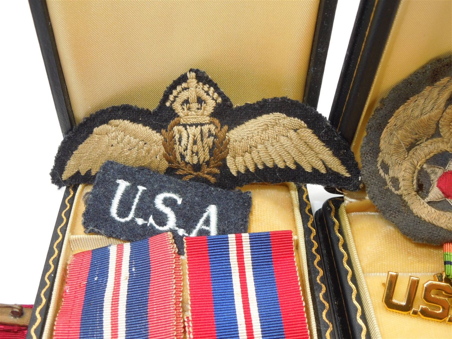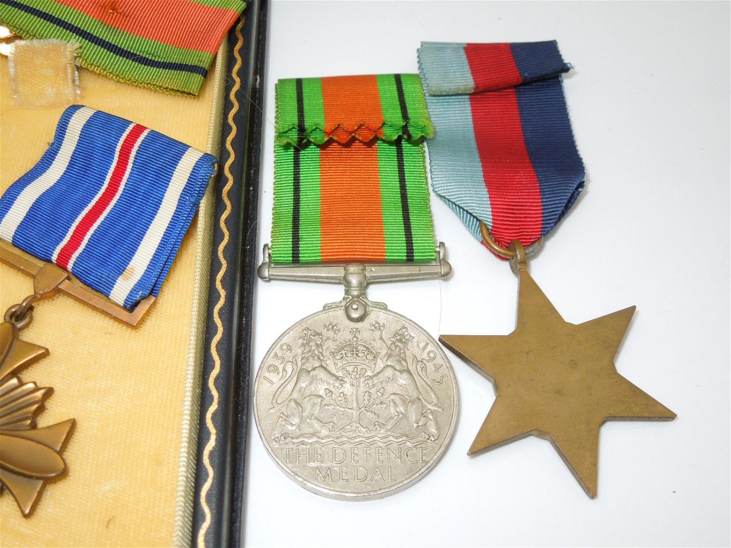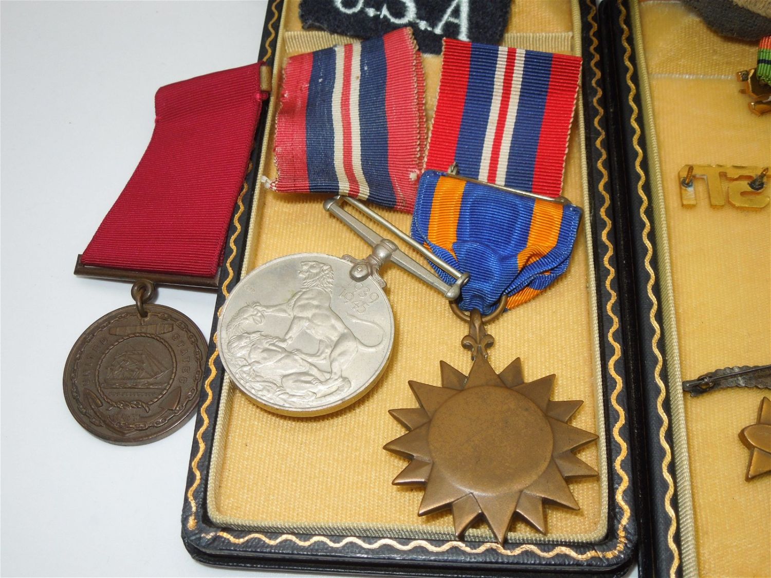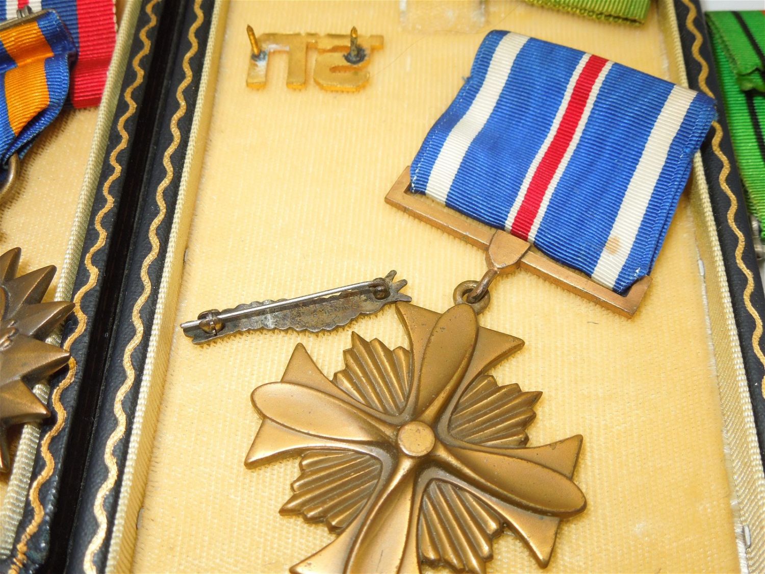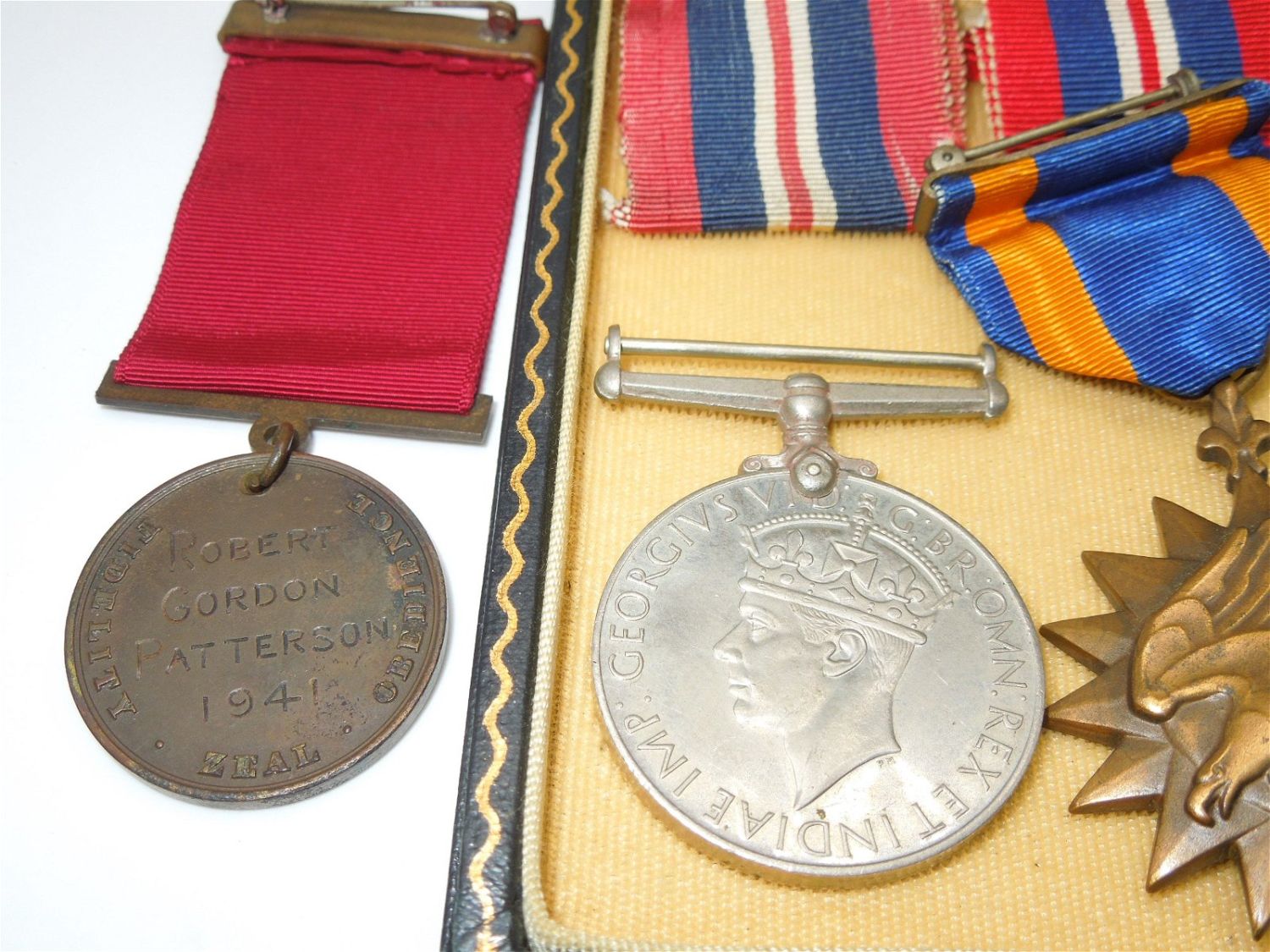 Named Medal Group to Robert Gordon Patterson. 1st Lt Robert G. Patterson was a WWII fighter pilot who was a member of the famed "Eagle Squadrons" that helped the British fight Nazi Germany before the United States entered the war. During the war he was attached to the 335th FS, 4th FG, 8AF USAAF formerley a 121 Eagle Squadron RAF Spitfire pilot. He flew Spitfires and P-47 Thunderbolts on 70 combat missions over Europe. On his last mission, on October 8, 1943, Patterson was shot down over Bremen, Germany, while escorting bombers. He evaded the enemy for 53 days before being captured in Amsterdam, according to military records. He spent the rest of the war in Stalag Luft I, a POW camp in Barth, Germany. The accounts of that day include his aircraft being attacked by German fighters over Holland. He was able to bale out and managed to evade capture for a time, but was finally captured in Amsterdam as a Prisoner of War (POW). Pattersons Awards include: DFC, AM (3OLC), PH, POW, WWII Victory, EAME. Included in this group only is a Boxed and engraved Distinguish Flying Cross (DFC), 8th Air Force Felt Patch, U.S. Insignia, Caterpillar Club Pin (PRES BY IRVING), U.S.A. felt tab, WWII English Defence Medal, WWII The 1939-1945 Star Campaign Medal, 1941 Engraved Good Conduct Medal, Boxed Air Medal (not named), Royal Air Force RAF padded pilot wing, and 1939-1945 British Campaign Medal with detached ribbons. Nice overall condition for its age.
