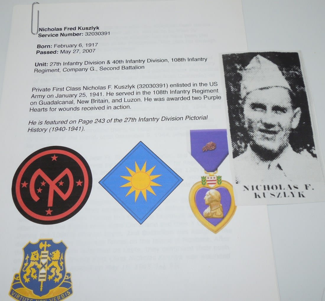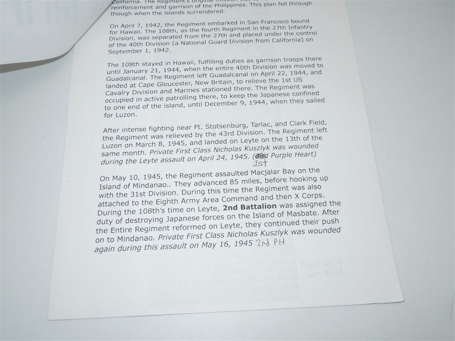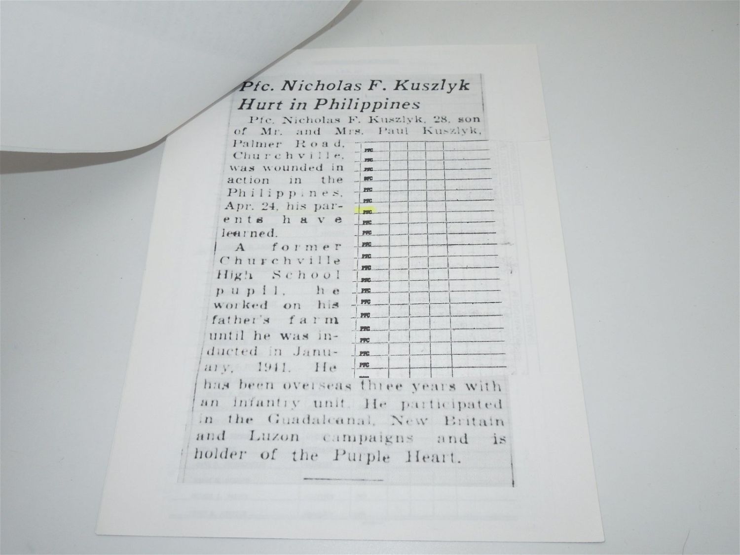 Post WWII government engraved issued medal to a Soldier wounded in action and served at Guadalcanal, New Britain, and Luzon. Comes with some copied research.