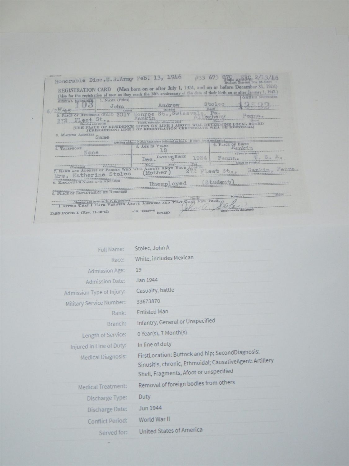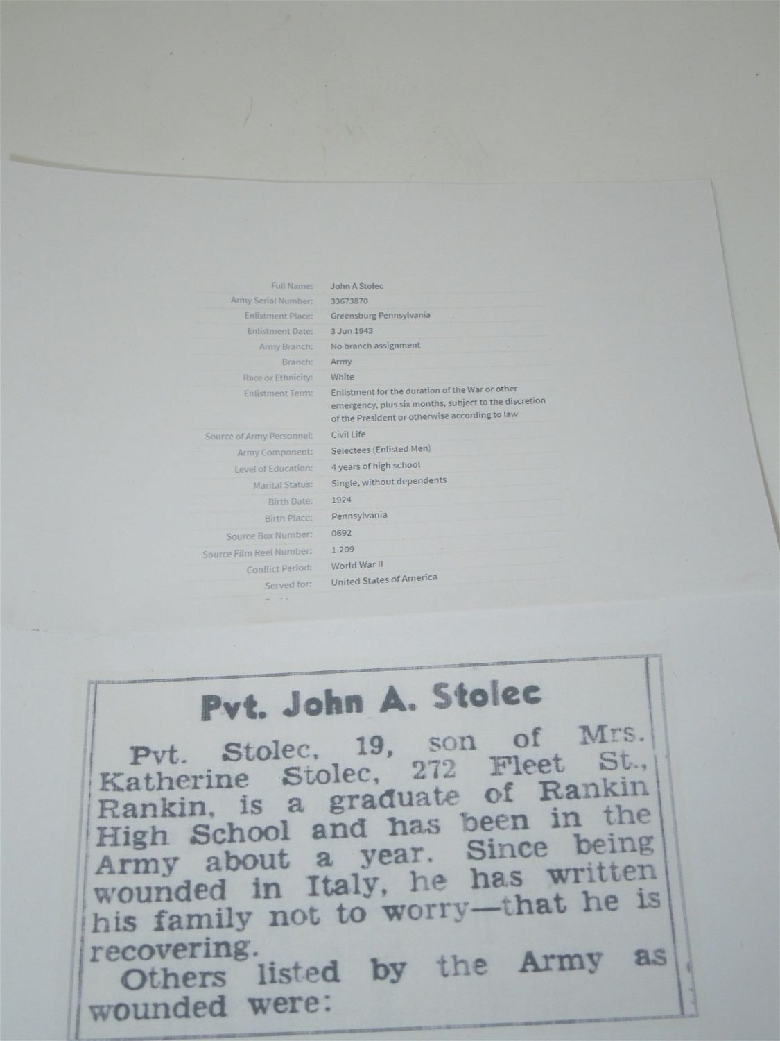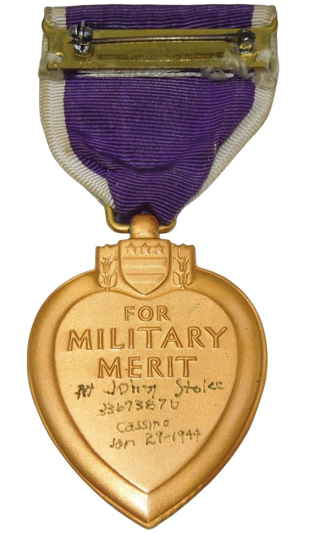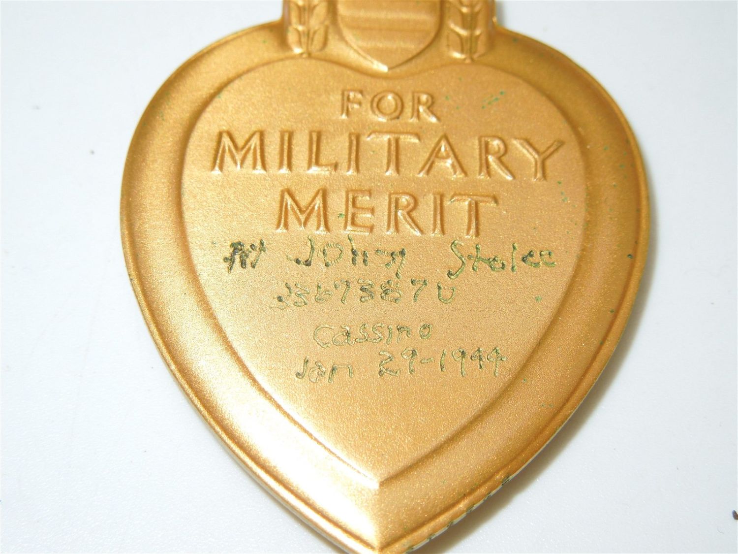 WWII slot brooch, numbered Purple Heart Medal, crudely engraved to Pvt. John Stolec, 33673870, Cassino (Italy), Jan 29, 1944. The medal comes with some copied research about his military service. Good condition.