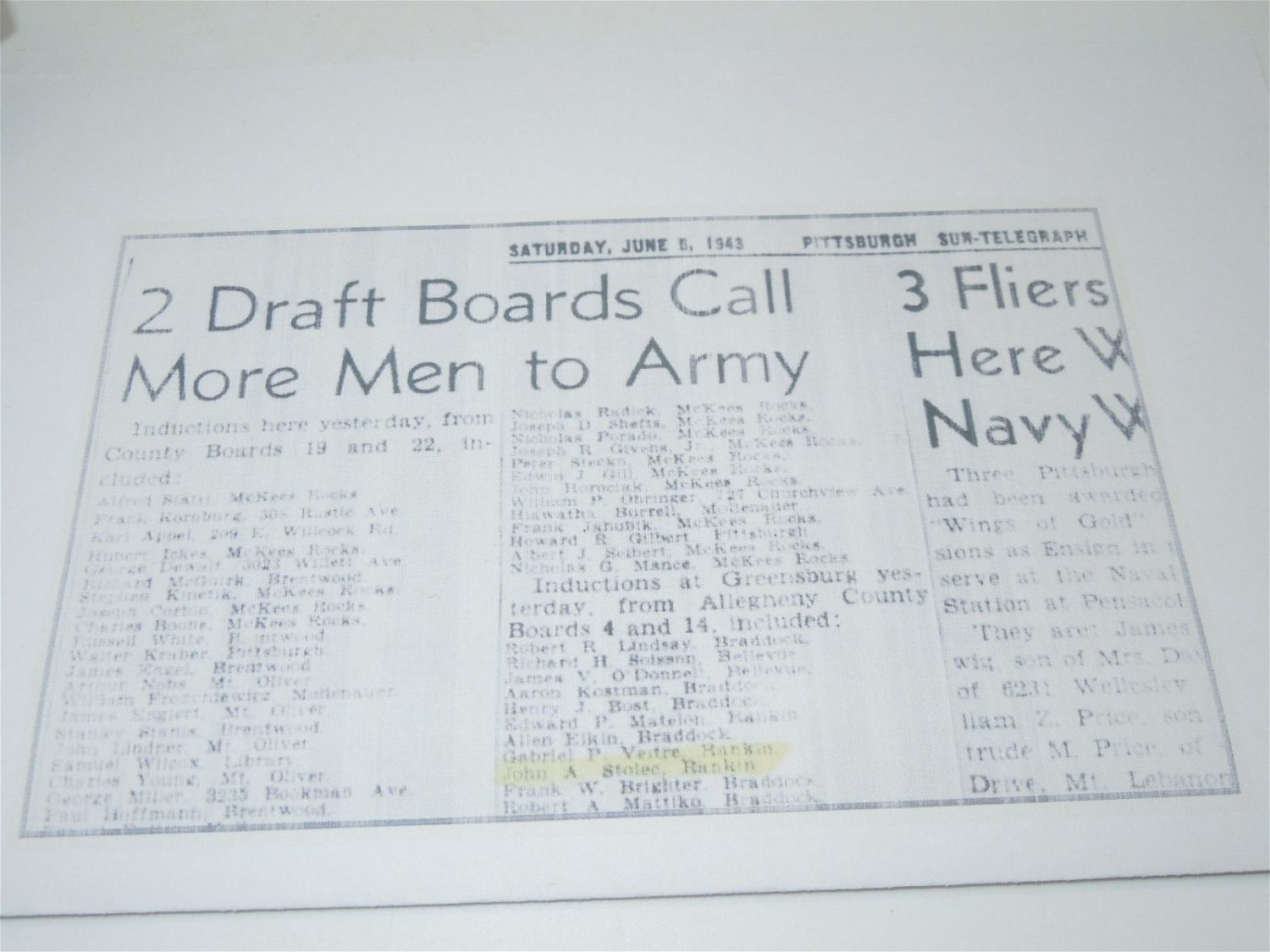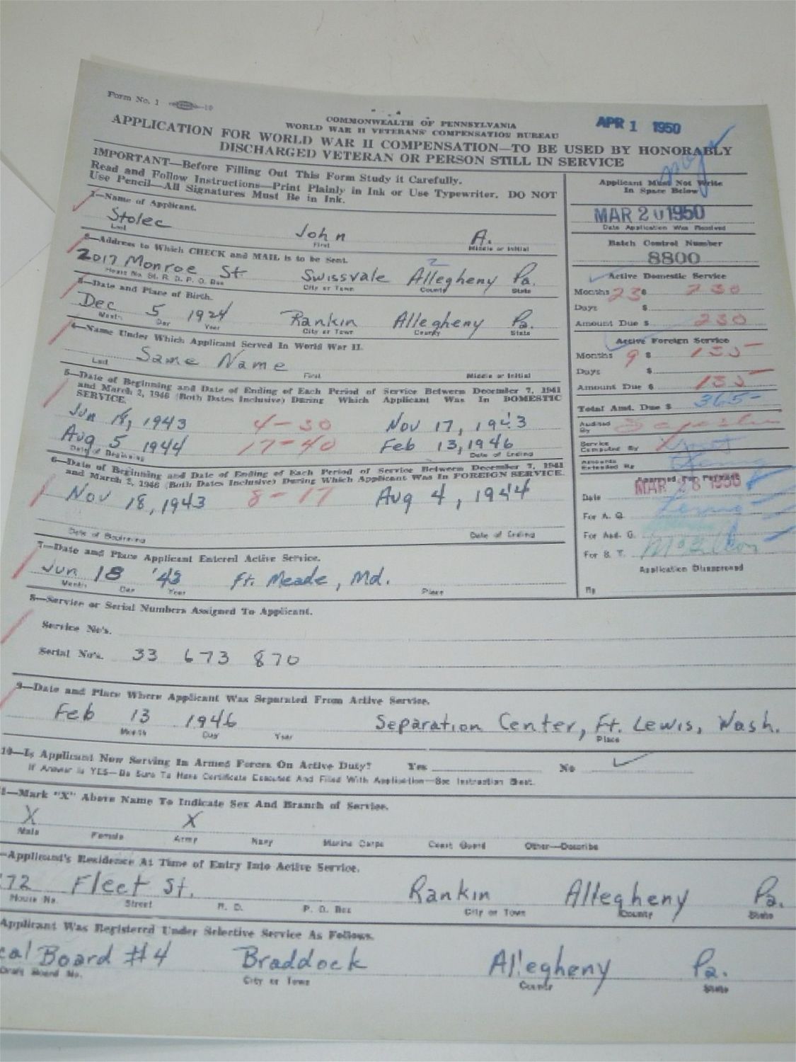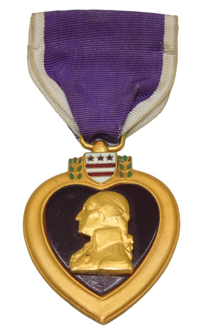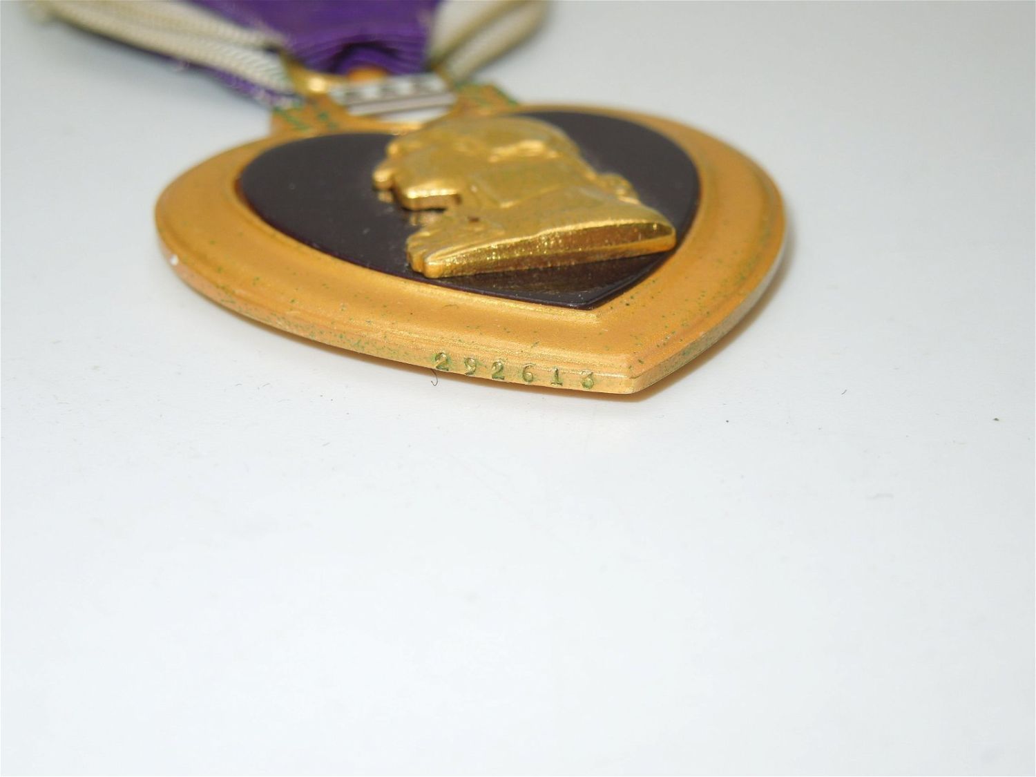WWII slot brooch, numbered Purple Heart Medal, crudely engraved to Pvt. John Stolec, 33673870, Cassino (Italy), Jan 29, 1944. The medal comes with some copied research about his military service. Good condition.