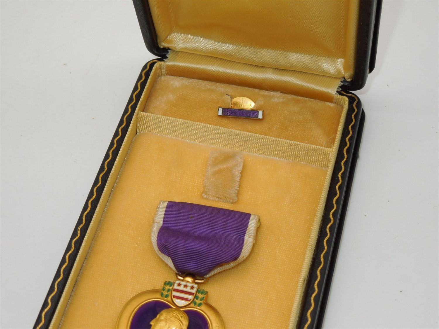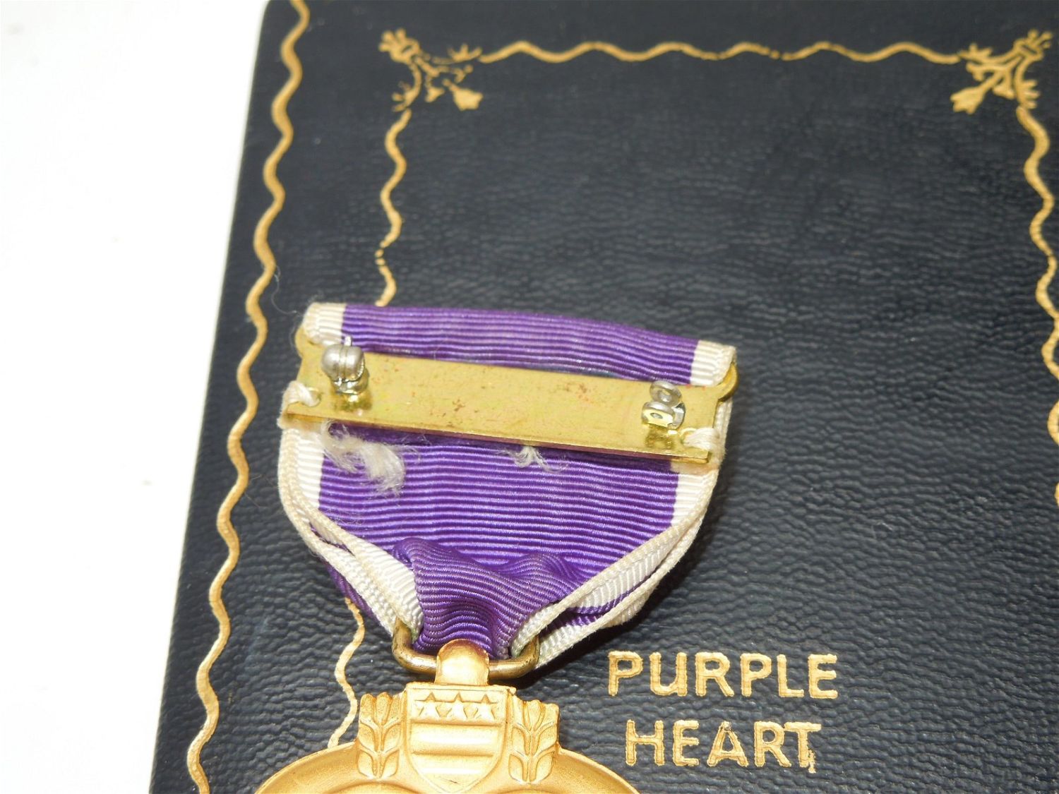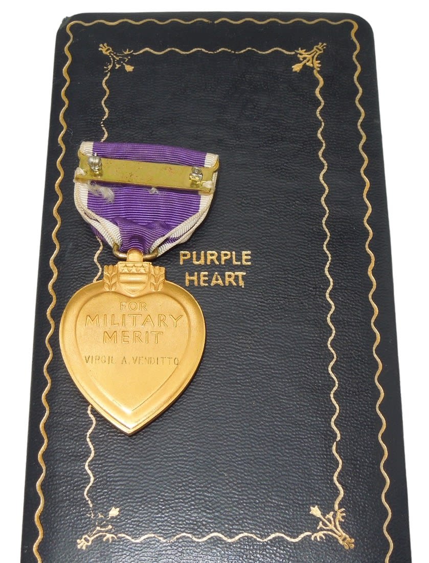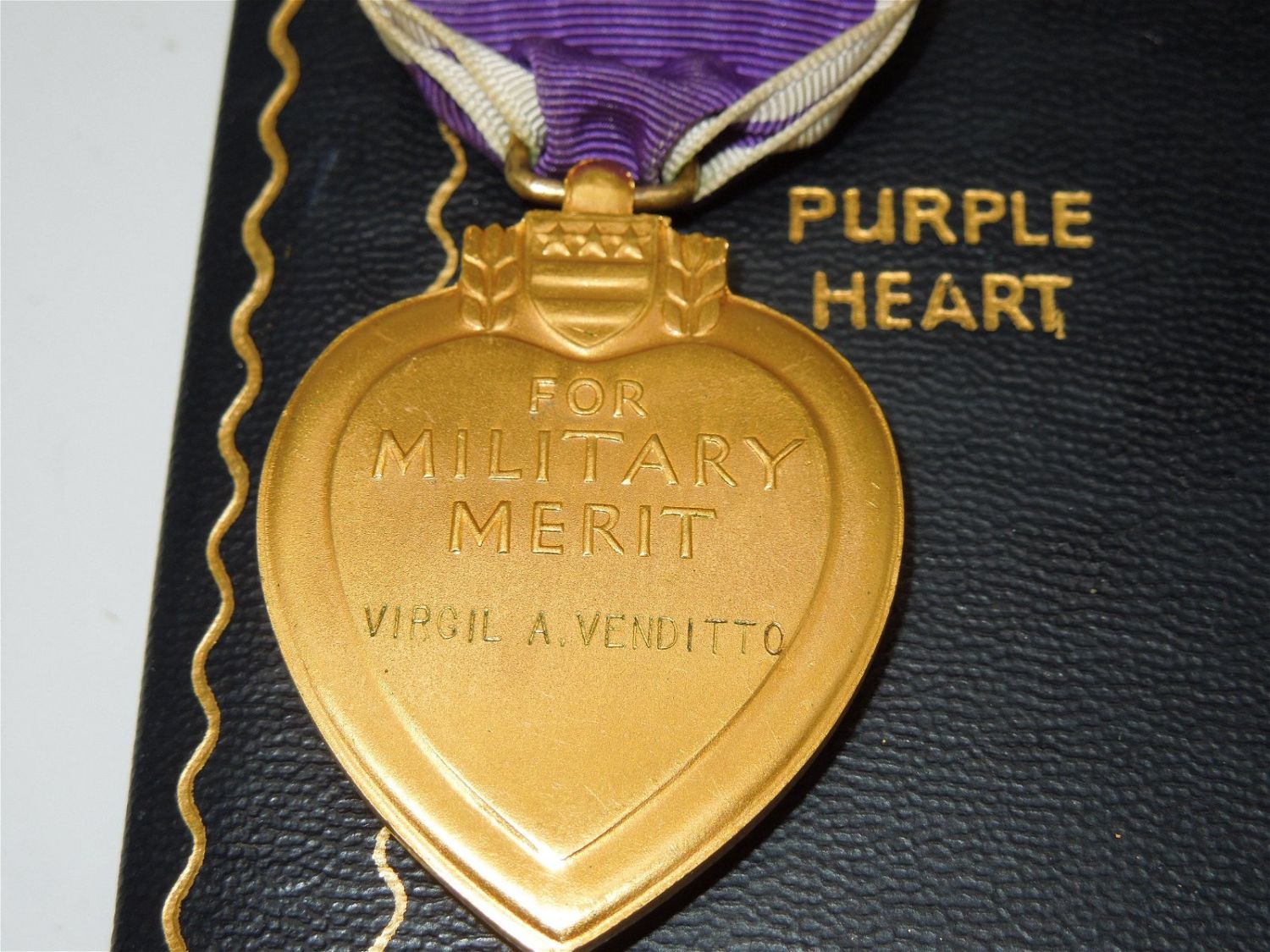 Original slot brooch WWII production, Korean War issued Purple Heart for wounds received in action by Pfc. Virgil A. Venditto, who was seriously wounded in October 1951 in North Korea. He was in the 25th Infantry Division. The pin is missing from the medal. Comes with titled leatherette case.