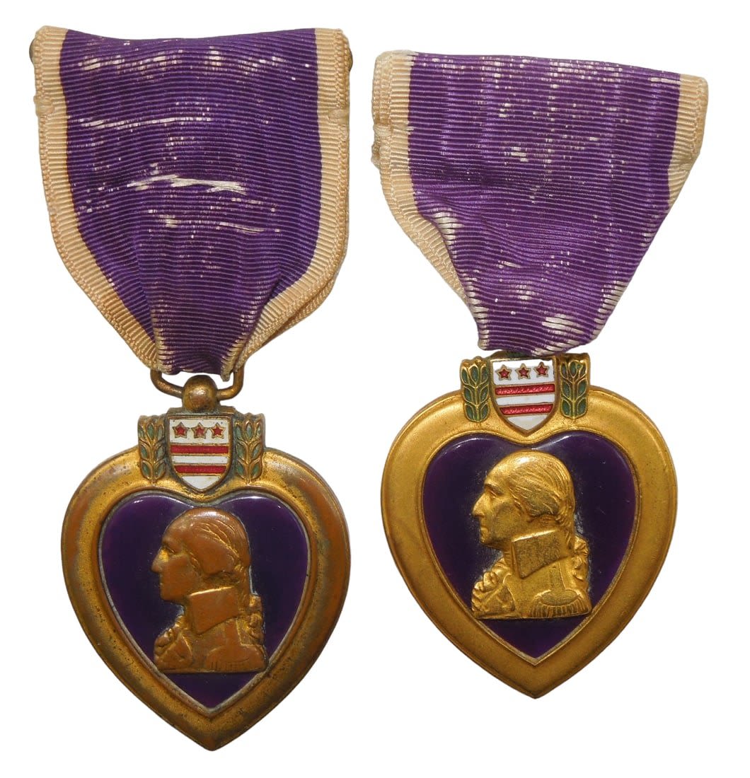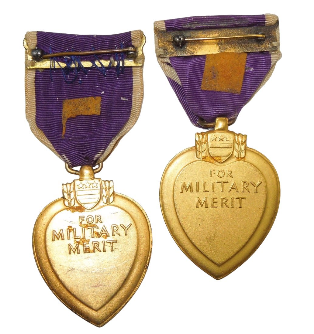 WWII slot brooch, non-numbered Purple Heart Medals in fair condition. Both ribbons exhibit wear, and one has a repaired brooch.