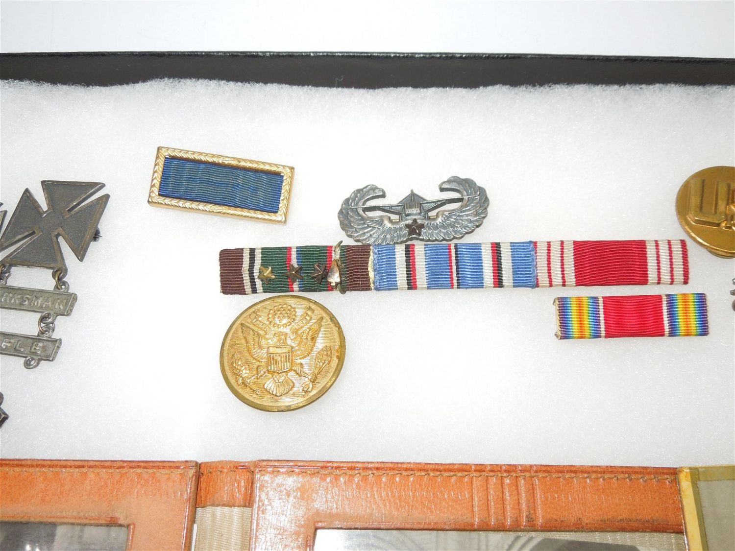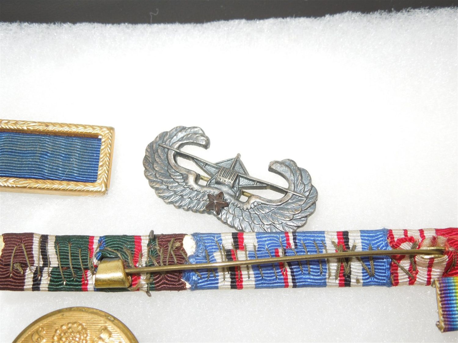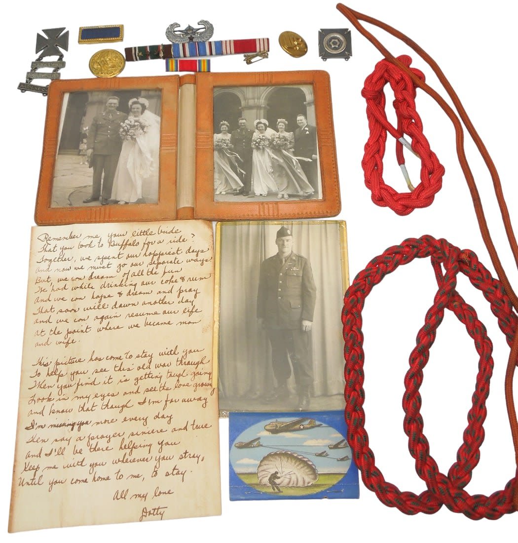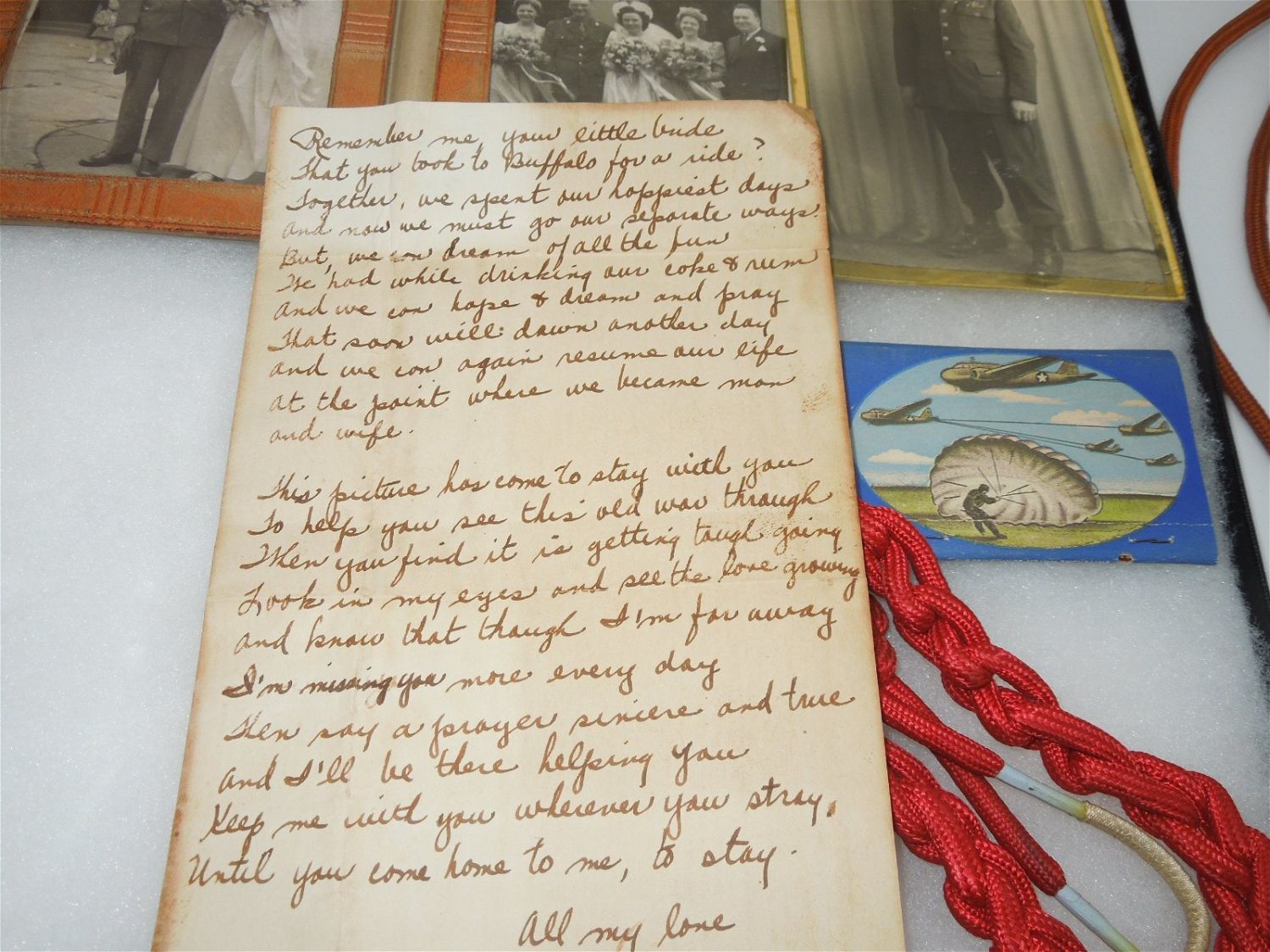 WWII Unnamed Glider Group as shown. This group is how the consignor received it years ago. The group is not named. It comes with a Glider Wing with a combat star. The wing is British made J.R. Gaunt London. Also, included are ribbons, PUC, photos, letter, cords, matches and more. One photo is dated 1944. Good overall condition. The display case does not come with this group.