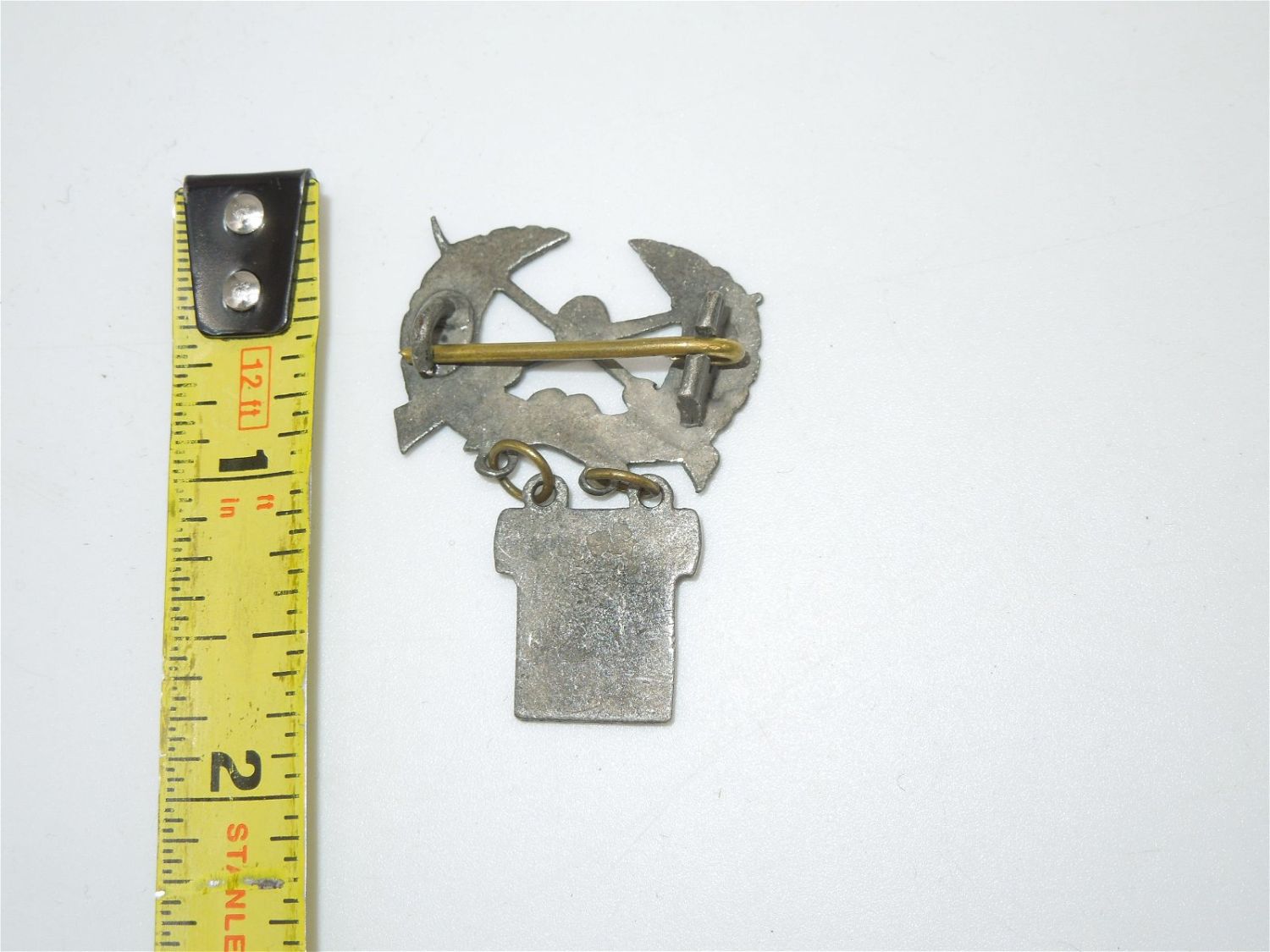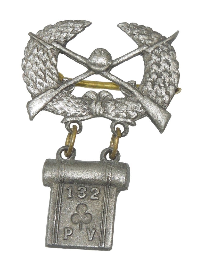 Original Civil War Pennsylvania Infantry Veterans Regimental badge. This device for the 132nd Pa. Vol. Infantry rates as one of the most striking Civil War veterans badges ever produced. It consists of a 1.25" wide wreath superimposed by crossed muskets with a forage cap in the center. Suspended beneath it is a silver knapsack with blanket roll. In lettering on the knapsack is "132" over a 2nd Corps trefoil, below which is the initials "PV." The badge shows its age but condition is sound with the original t-bar clasp from the reverse. The 132nd was a nine-months unit that saw action at Antietam, Fredericksburg, and Chancellorsville. Service The 132nd Pennsylvania Infantry was organized at Harrisburg, Pennsylvania, in August 1862 and mustered in under the command of Colonel Richard A. Oakford. The regiment was attached to 1st Brigade, 3rd Division, II Corps, Army of the Potomac, to November 1862. 2nd Brigade, 3rd Division, II Corps, to May 1863. The 132nd Pennsylvania Infantry mustered out May 24, 1863. Detailed service moved to Washington, D.C., August 19, and performed duty there until September 2. Ordered to Rockville, Md., September 2. Maryland Campaign September 6-22, 1862. Battle of Antietam, Md., September 16-17. Moved to Harpers Ferry, Va., September 22, and duty there until October 30. Reconnaissance to Leesburg October 1-2. Advanced up Loudon Valley and movement to Falmouth, Va., October 30-November 17. Battle of Fredericksburg December 12-15. Duty at Falmouth until April 27. Chancellorsville Campaign April 27-May 6. Battle of Chancellorsville May 1-5.