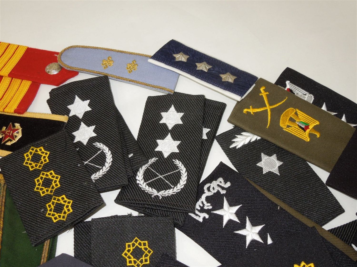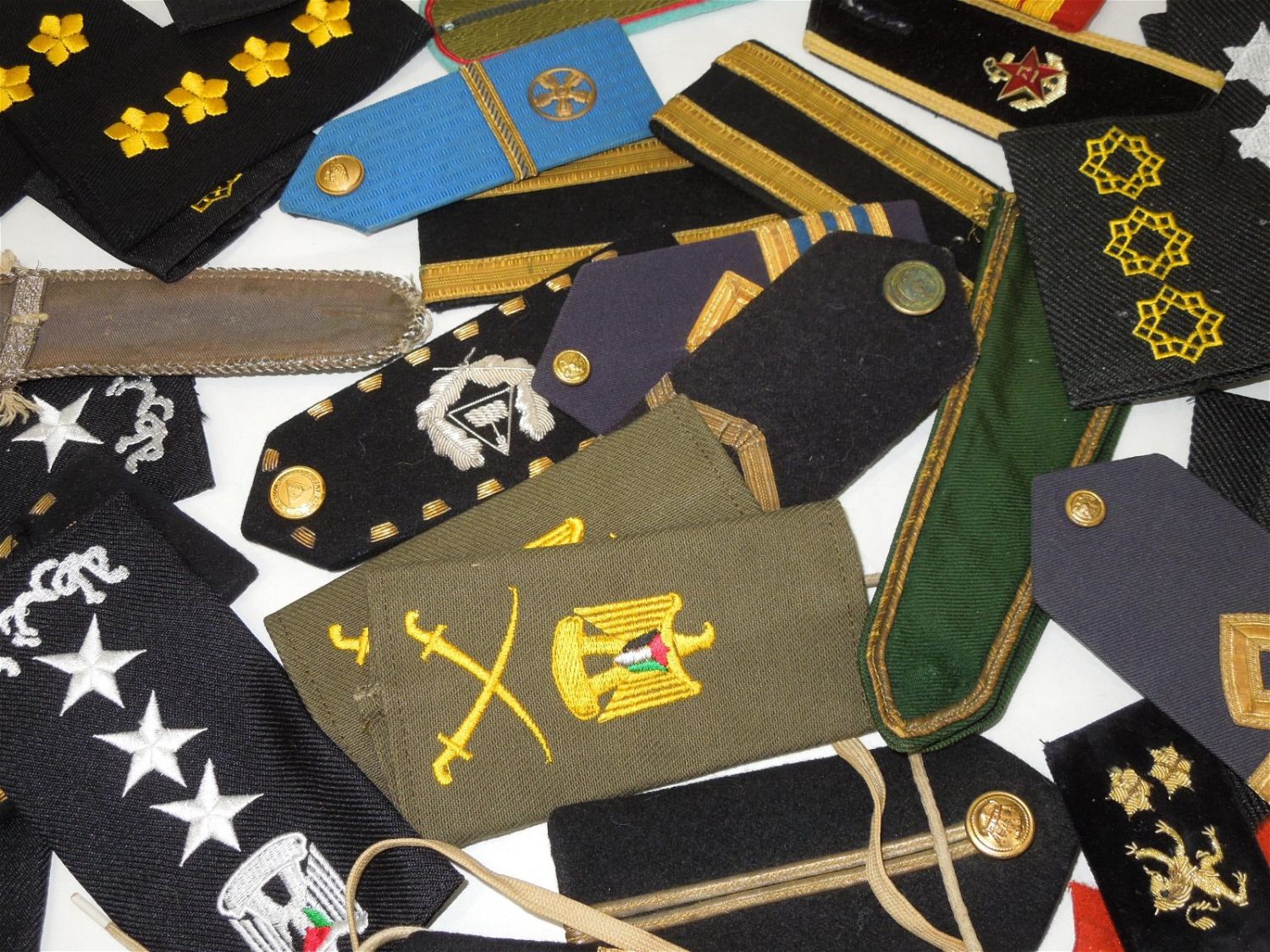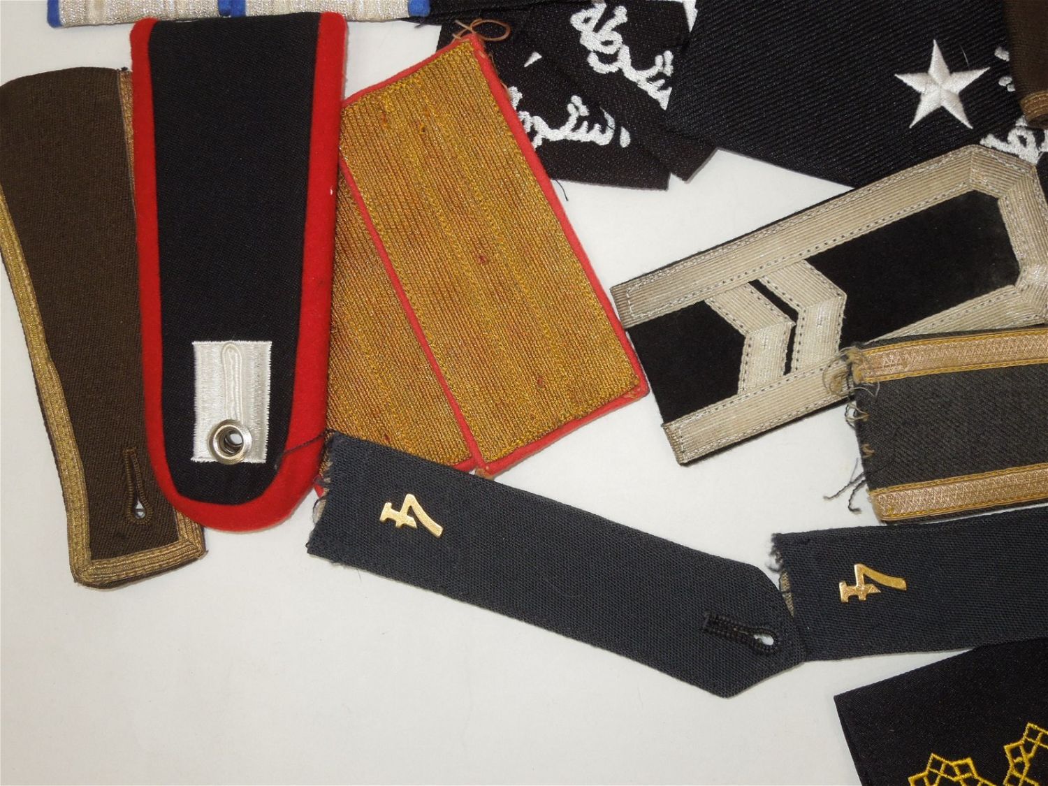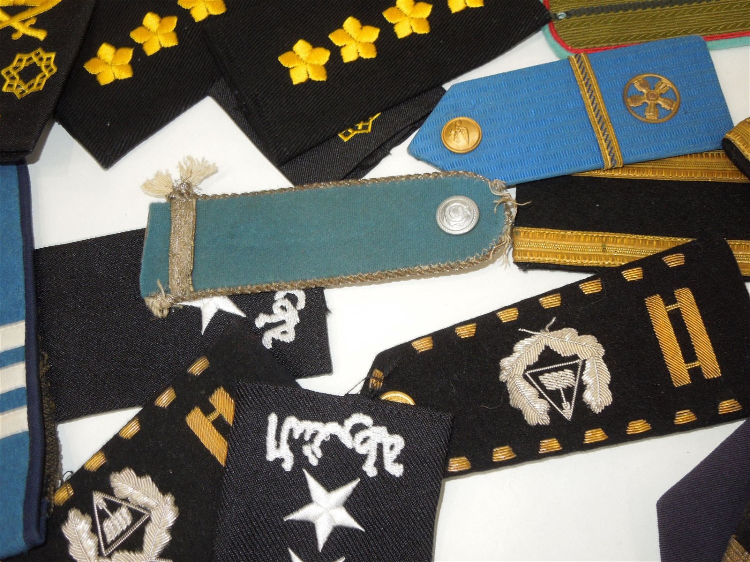 Large lot of singles and pairs of shoulder boards. Condition ranges from fair to excellent. Many Palestine Security Forces, Some eastern European / Russian, and more.