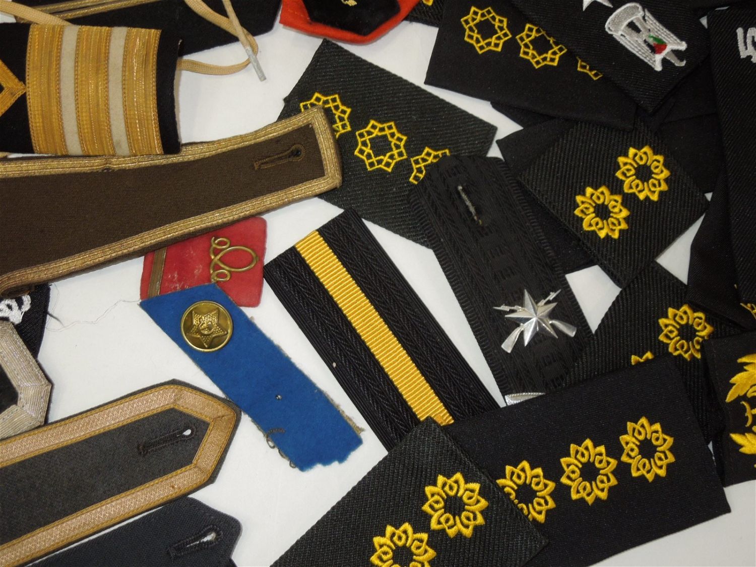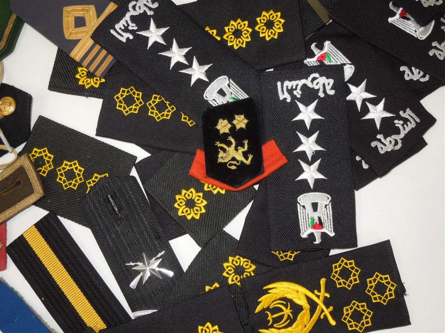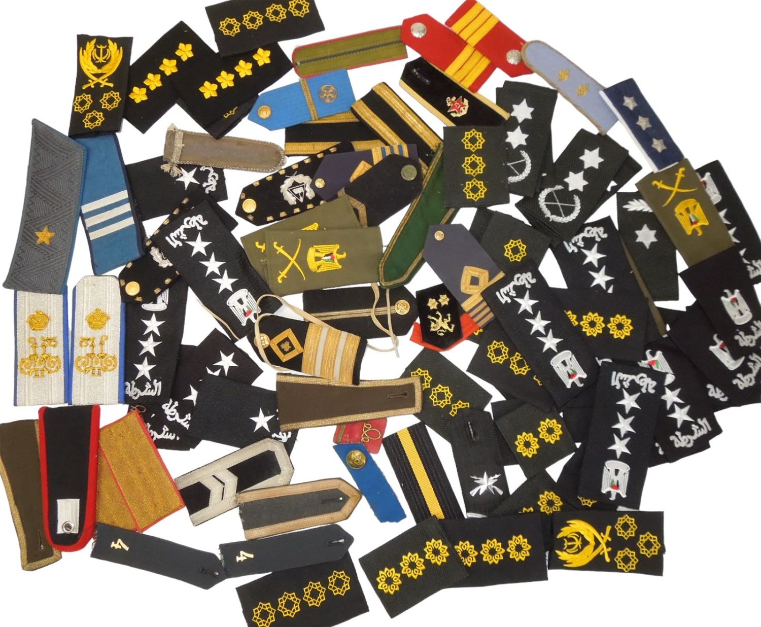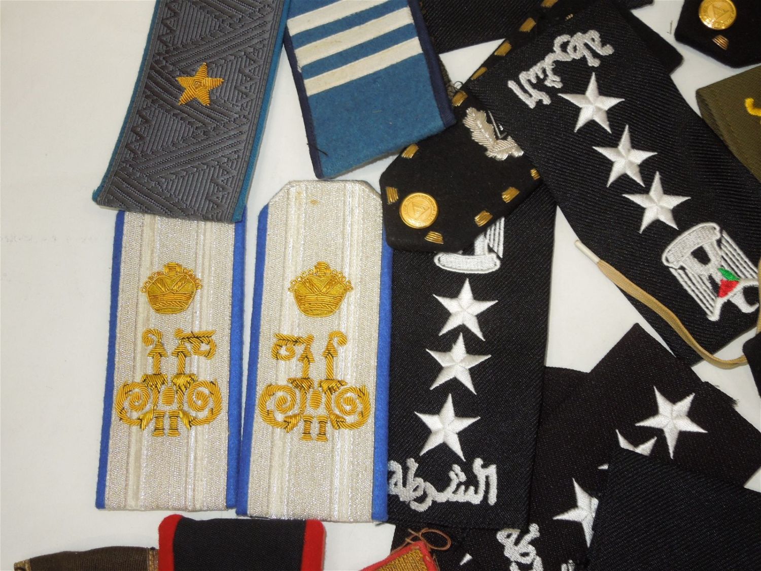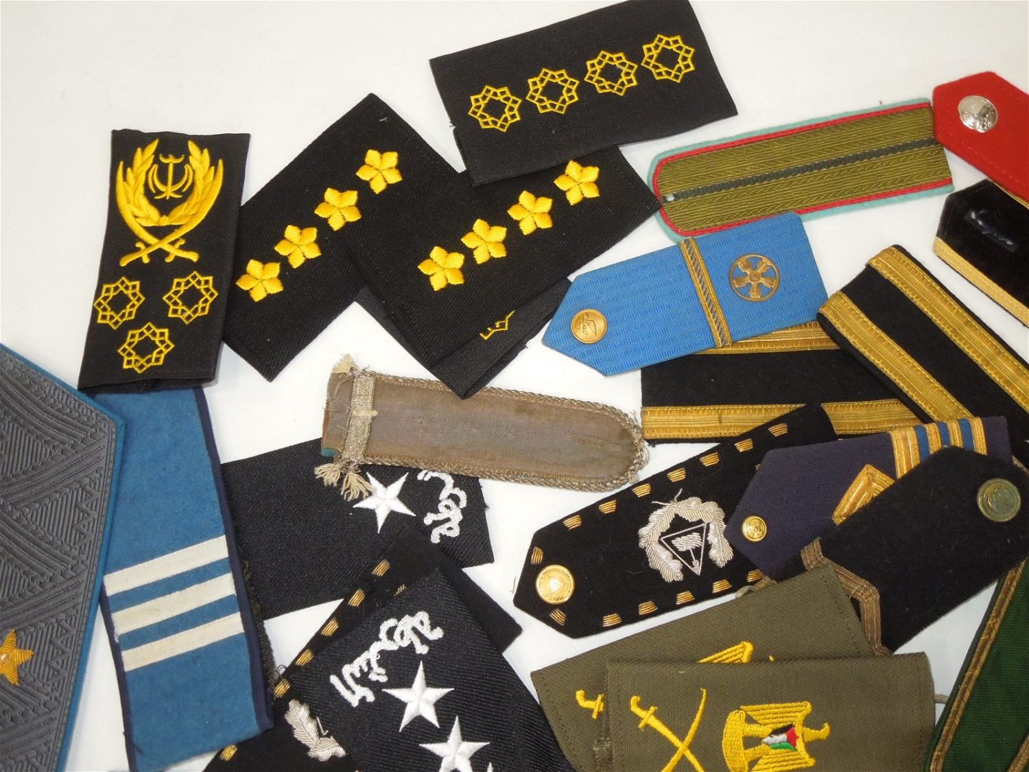 Large lot of singles and pairs of shoulder boards. Condition ranges from fair to excellent. Many Palestine Security Forces, Some eastern European / Russian, and more.