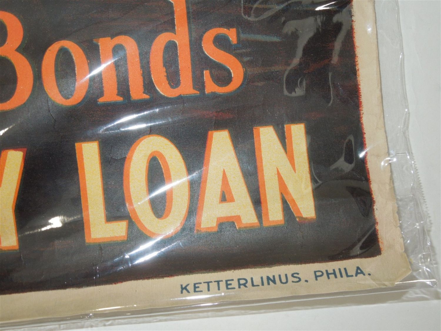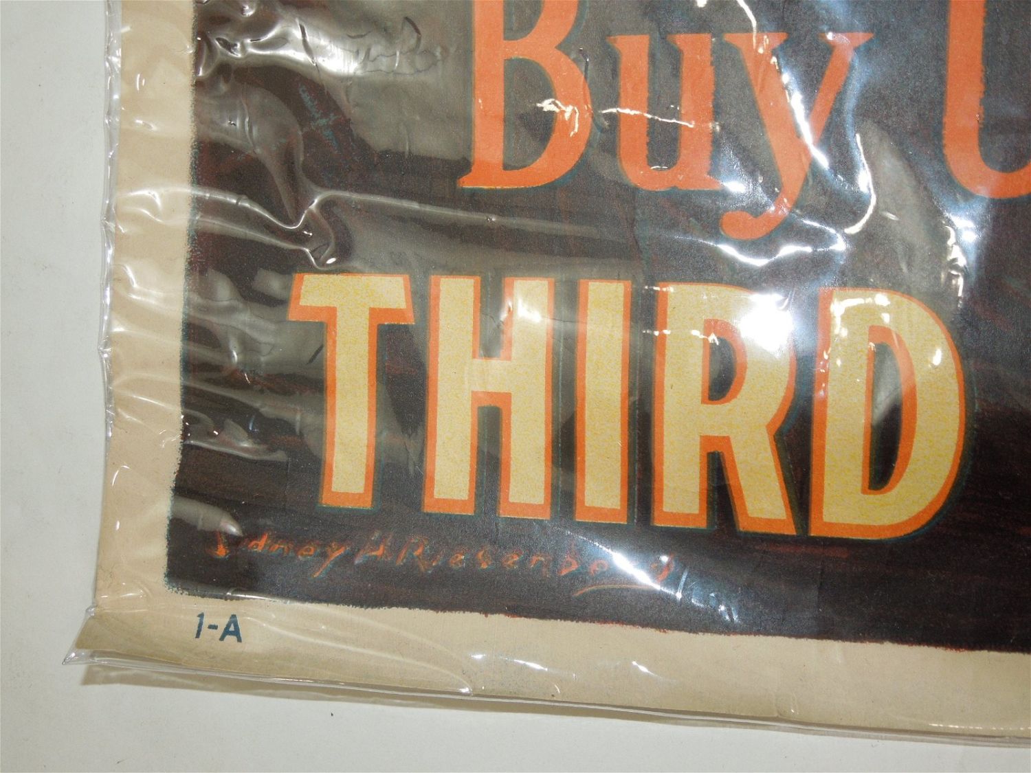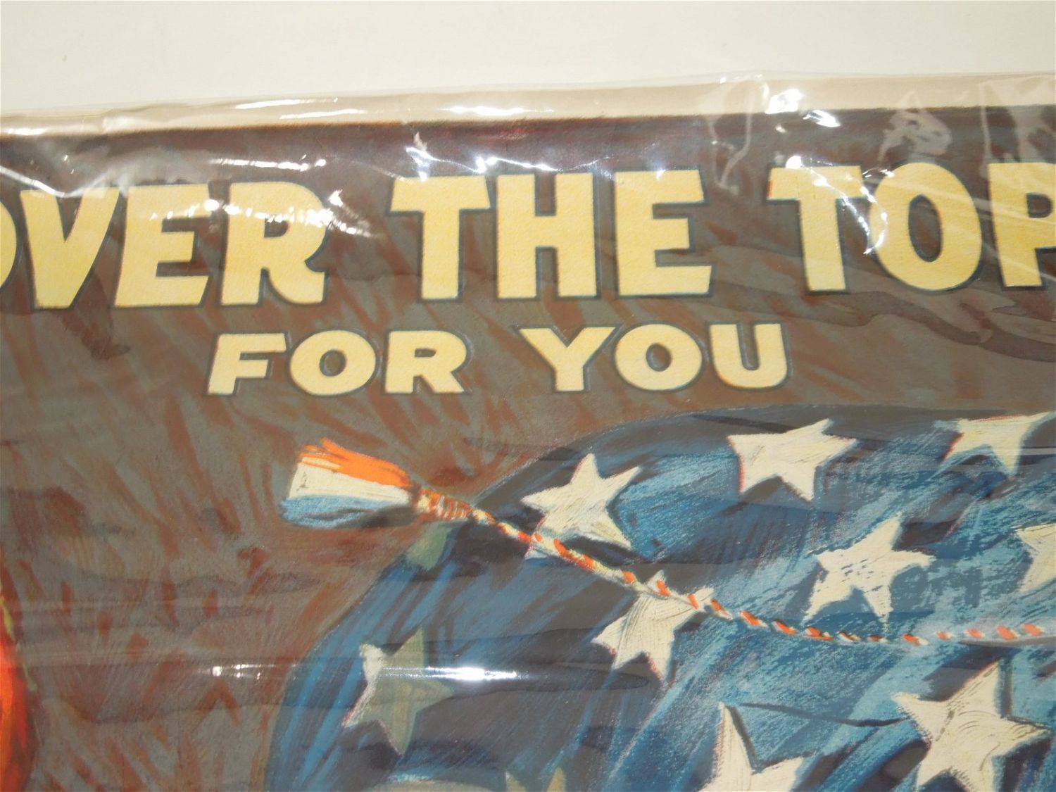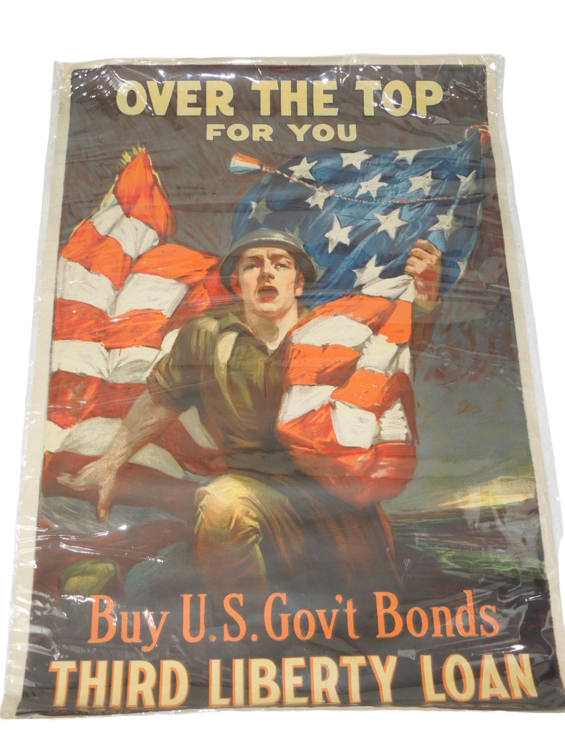 OVER THE TOP – FOR YOU WWI US poster. Colorful presentation of a soldier moving forward with a waving American flag. Also Buy US Govt Bonds – THIRD LIBERTY LOAN. 29 3/4 x 20 inches. Rolled and in a removable plastic sleeve. Some damage to the edges.